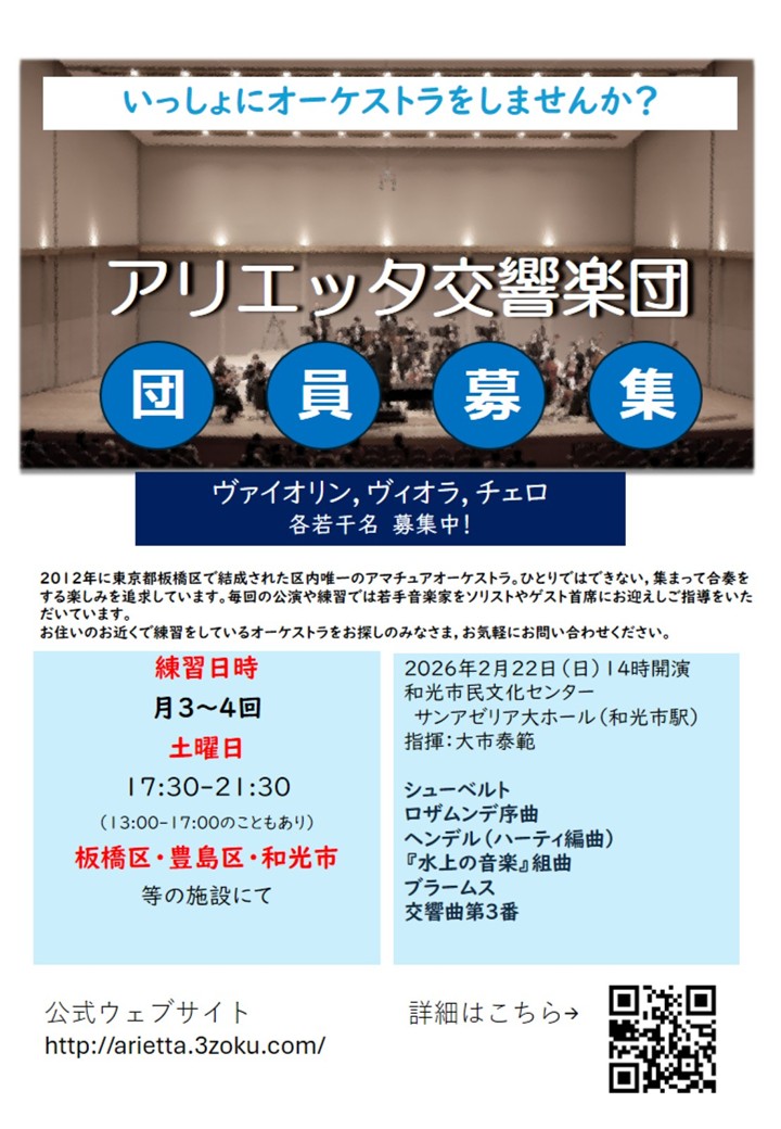 アリエッタ交響楽団は、東京都板橋区を拠点とする唯一のアマチュアオーケストラです。毎週土曜日主として板橋区、その他豊島区・北区・埼玉県和光市で練習をしております。
